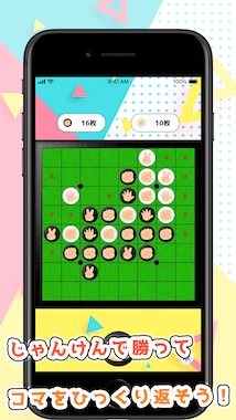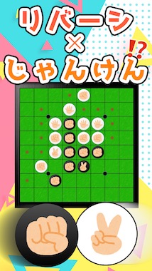 リバーシにじゃんけんの要素を追加。置いたコマと周辺のコマをじゃんけんさせ、勝ったコマを裏返すことができる。